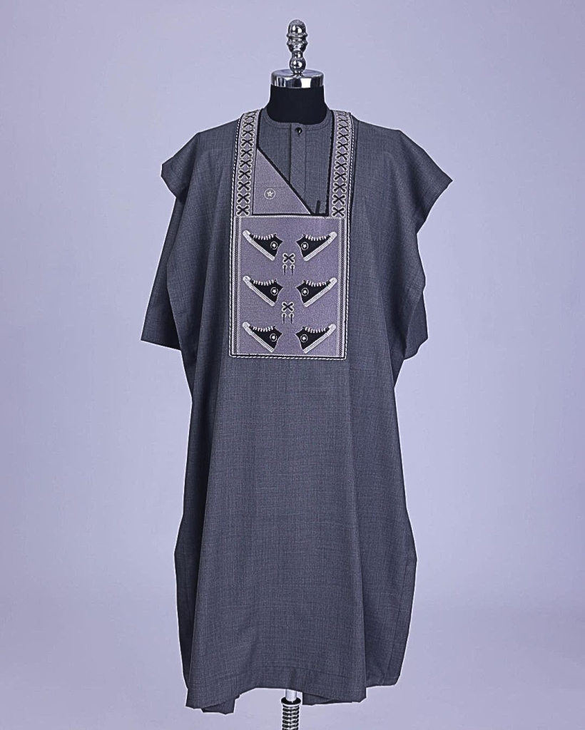 An Iron Grey, stepping all stars metallic wire embroidery details agbada