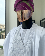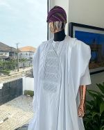 A Cocaine White dotted round and interwoven line embroidery agbada, 3/4 sleeve kaftan, Handpicked aso oke fila & Sokoto