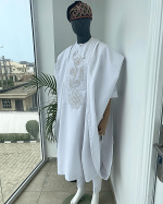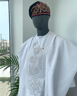 A Cocaine white with a floral Japanese intersection design with Swarovski stone detailing Agbada, 3/4 sleeve senator kaftan, hand woven ijebu hat & Sokoto