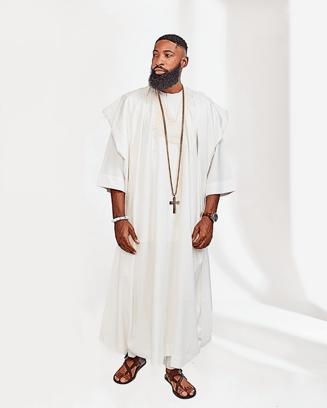 A Milk White embroidery detailing African Agbada, 3/4 sleeve kaftan and Sokoto