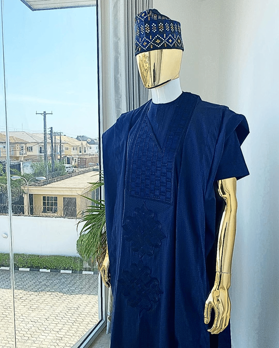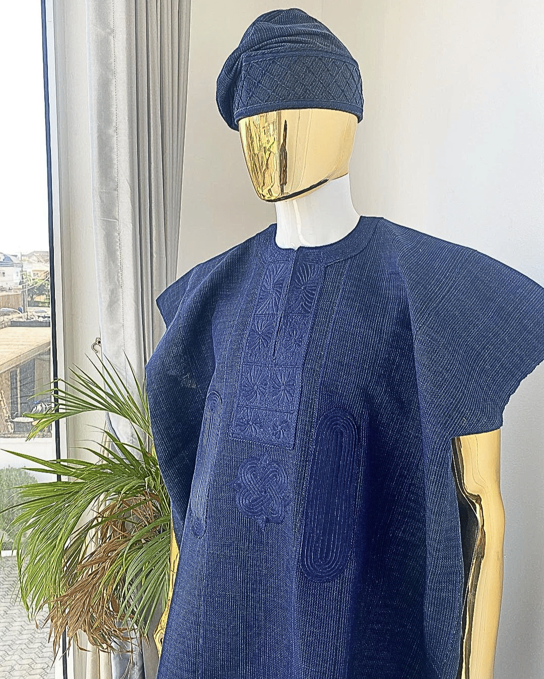 A navy blue aso oke dashiki with a floral and box-shaped embroidery design and hand-embroidered Yoruba hat