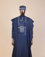 A Navy blue vexing demagogue metallic wire embroidery details agbada, 3/4 sleeve kaftan, hat and Sokoto