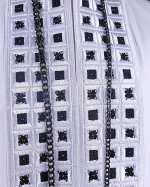 A white, connected square embroidery design with matching black and silver Swarovski stone details