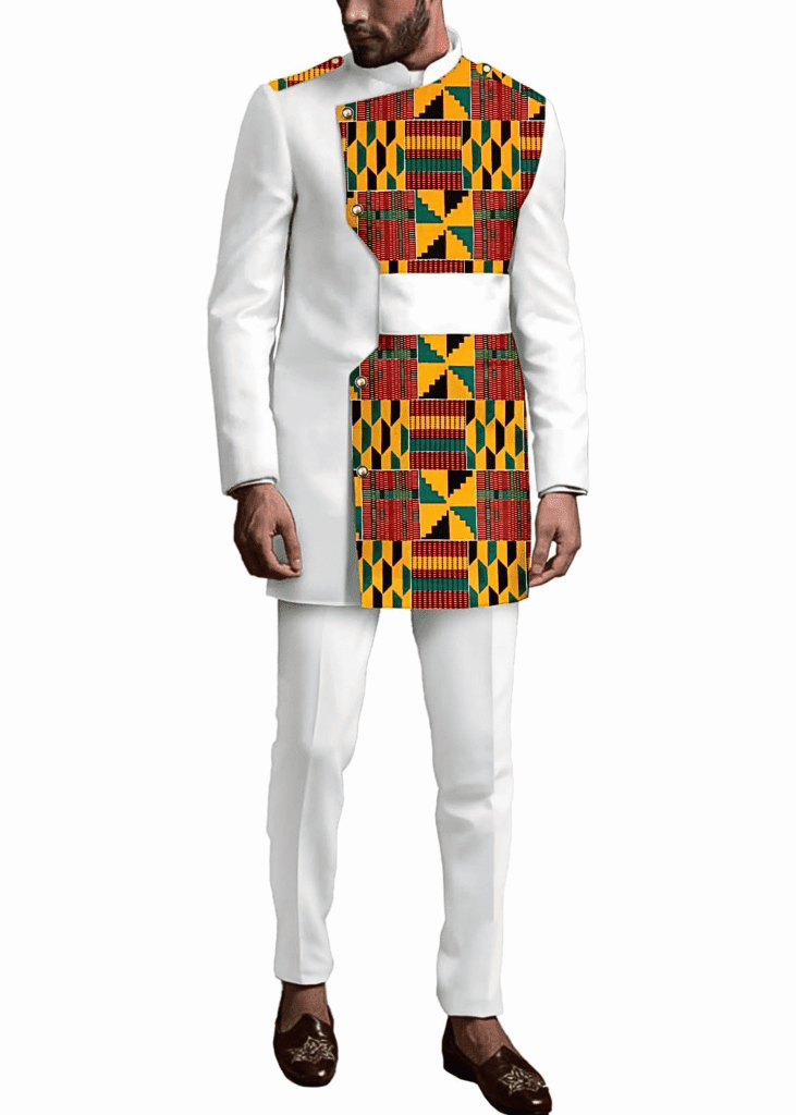 African Suit for Men Kente Print Dashiki Jacket and Pants Ethnic 2 Piece Outfit Wedding Party Clothes Attire